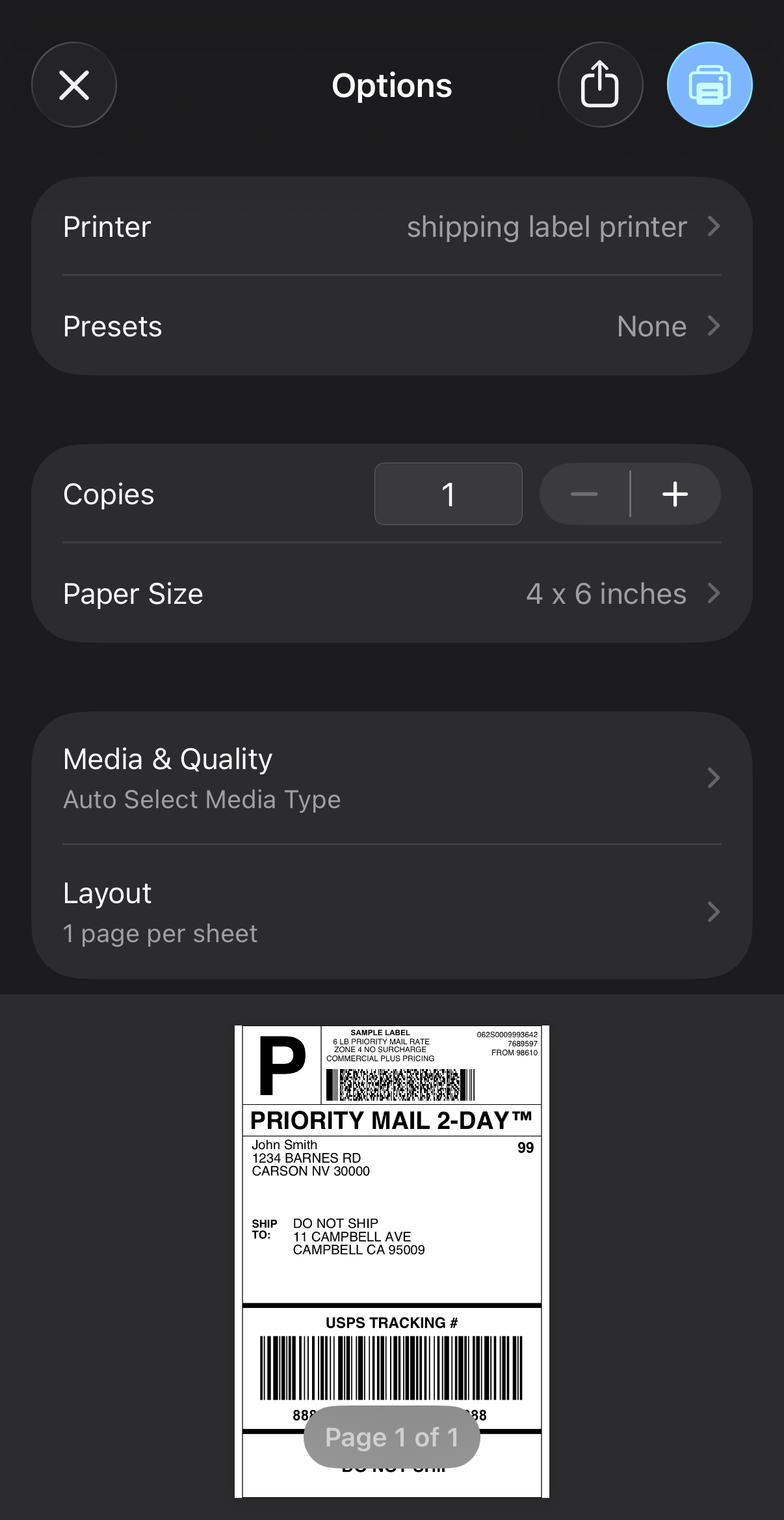 Test it by printing a test shipping label like this one from PirateShip and selecting the printer in the AirPrint sheet. Also, set the paper size to 4x6 inches for the labels.